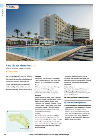 68 To book, call 0808 278 5931 or visit saga.co.uk/europeMINORCAFacilitiesRestaurant %u2022 Free bar open 11 hours a day %u2022 Bar %u2022 Outdoor swimming pool %u2022 Gym %u2022 Sun terrace %u2022 Wi-Fi. There is a lift to all floors.Rooms328 rooms %u2022 Inland or sea view %u2022 Balcony or terrace %u2022 TV %u2022 Mini fridge %u2022 Kettle. Most rooms have a bath (A room with a walk-in shower is available on request).ActivitiesGuided orientation walks %u2022 Yoga %u2022 Pilates and stretching classes %u2022 Cami de Cavalls trail for walking, located nearby %u2022 Guided walks %u2022 Archery %u2022 Rifle shooting %u2022 Petanque %u2022 Darts %u2022 Bowling green %u2022 Tennis courts %u2022 Gym %u2022 Bike rental (extra charge). There is a choice of optional excursions available for an extra cost, subject to availability.LocationThe small, purpose-built resort of S%u2019Algar stands on a rocky headland known for its coves, capes and islets. It is a pretty, peaceful place with a couple of small supermarkets and a restaurant, all reached from the hotel via a quiet sloping road and along the long, level promenade.The nearest bus stop from the hotel is 100 yards away and there is a regular bus service to Mah%u00f3n 20 minutes away. The drive to/from the airport takes approximately 25 minutes.Out and aboutThe island%u2019s vibrant capital Mah%u00f3n, with its elegant Georgian-style architecture, is approximately six-and-a-half miles away and can be reached by bus.For more details visit saga.co.uk/mn3g1Special interest departures%u2022 The Archaeology of Magnificent Menorca7 nights from %u00a31,425 departing 15 October, 2026. Discover the island%u2019s ancient wonders during five included excursions with 11 archaeological visits and three talks from an expert host. Other departures available 23 April and and 24 September, 2026. Holiday code: AV30Set in the peaceful resort of S%u2019Algar, this hotel has excellent facilities and a lively all-inclusive atmosphere. There are several scenic walking trails nearby, from where you can admire the lovely Minorcan scenery.Alua Illa de Menorca HHHHS%u2019Algar, Minorca, Balearic IslandsALL INCLUSIVECabo deCavalleriaCiutadellaMah%u00f3nMonte ToroAlua Illa de MenorcaS'Algar358ME N O RCA%u2022No single Alua Illa de MenorcasupplementHotel Point of interest