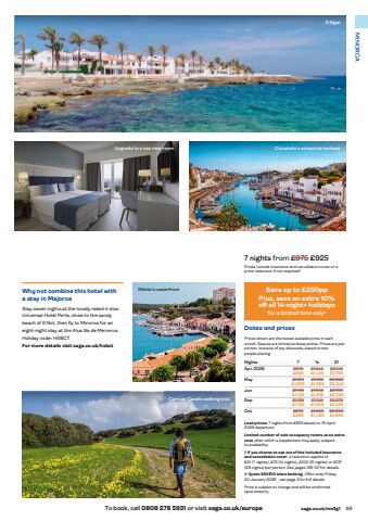 To book, call 0808 278 5931 or visit saga.co.uk/europe saga.co.uk/mn3g1 69MINORCAWhy not combine this hotel witha stay in MajorcaStay seven nights at the locally rated 4-star Universal Hotel Perla, close to the sandy beach of S%u2019illot, then fly to Minorca for an eight-night stay at the Alua Illa de Menorca. Holiday code: HSBCTFor more details visit saga.co.uk/hsbct7 nights from %u00a3975 %u00a3925Prices include insurance and cancellation cover or a price reduction if not required%u00a7.Dates and pricesPrices shown are the lowest available price in each month. Spaces are limited at these prices. Prices are per person, inclusive of any discounts, based on two people sharing.Nights 7 14 21Apr, 2026 %u00a3975- %u00a31,545- %u00a32,145- %u00a3925 %u00a31,445 %u00a31,795May %u00a31,125- %u00a31,725- %u00a32,395- %u00a31,075 %u00a31,625 %u00a32,245Jun %u00a31,195- %u00a31,945- %u00a32,725- %u00a31,125 %u00a31,815 %u00a32,525Sep %u00a31,195- %u00a31,745- %u00a32,275- %u00a31,125 %u00a31,645 %u00a32,125Oct %u00a3975- %u00a31,565- %u00a32,095- %u00a3925 %u00a31,465 %u00a31,965Lead prices: 7 nights from %u00a3925 based on 16 April 2026 departure.Limited number of sole occupancy rooms at no extra cost, after which a supplement may apply, subject to availability.%u00a7 If you choose to opt out of the included insurance and cancellation cover, a reduction applies of %u00a331%u00a0(7 nights), %u00a372 (14 nights), %u00a3102 (21 nights) or %u00a3137 (28 nights) per person. See pages 128-131 for details.# Quote SAVE10 when booking. Offer ends Friday 30 January 2026 - see page 3 for full details.Price is subject to change and will be confirmed upon enquiry.Upgrade to a sea view room Ciutadella%u2019s attractive harbour Cami de Cavalls walking trailMah%u00f3n%u2019s waterfrontS%u2019AlgarSave up to %u00a3350ppPlus, save an extra 10% off%u00a0all%u00a014-night+ holidaysfor a limited time only#