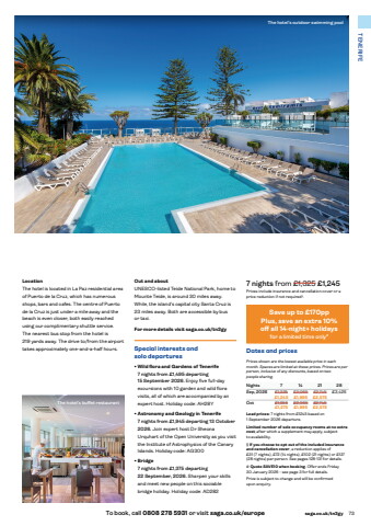 To book, call 0808 278 5931 or visit saga.co.uk/europe saga.co.uk/tn3gy 73TENERIFE7 nights from %u00a31,325 %u00a31,245Prices include insurance and cancellation cover or a price reduction if not required%u00a7.Dates and pricesPrices shown are the lowest available price in each month. Spaces are limited at these prices. Prices are per person, inclusive of any discounts, based on two people sharing.Nights 7 14 21 28Sep, 2026 %u00a31,325- %u00a32,065- %u00a32,745- %u00a33,425%u00a31,245 %u00a31,895 %u00a32,575Oct %u00a31,355- %u00a32,065- %u00a32,745-%u00a31,275 %u00a31,895 %u00a32,575Lead prices: 7 nights from %u00a31245 based on 1 September 2026 departure.Limited number of sole occupancy rooms at no extra cost, after which a supplement may apply, subject to availability.%u00a7 If you choose to opt out of the included insurance and cancellation cover, a reduction applies of %u00a331%u00a0(7 nights), %u00a372 (14 nights), %u00a3102 (21 nights) or %u00a3137 (28 nights) per person. See pages 128-131 for details.# Quote SAVE10 when booking. Offer ends Friday 30 January 2026 - see page 3 for full details.Price is subject to change and will be confirmed upon enquiry.LocationThe hotel is located in La Paz residential area of Puerto de la Cruz, which has numerous shops, bars and cafes. The centre of Puerto de la Cruz is just under a mile away and the beach is even closer, both easily reached using our complimentary shuttle service. The nearest bus stop from the hotel is 219 yards away. The drive to/from the airport takes approximately one-and-a-half hours.Out and aboutUNESCO-listed Teide National Park, home to Mounte Teide, is around 30 miles away. While, the island%u2019s capital city Santa Cruz is 23 miles away. Both are accessible by bus or taxi.For more details visit saga.co.uk/tn3gySpecial interests andsolo departures%u2022 Wild flora and Gardens of Tenerife7 nights from %u00a31,495 departing 15 September 2026. Enjoy five full-day excursions with 10 garden and wild flora visits, all of which are accompanied by an expert host. Holiday code: AH28Y%u2022 Astronomy and Geology in Tenerife7 nights from %u00a31,945 departing 13 October 2026. Join expert host Dr Sheona Urquhart of the Open University as you visit the Institute of Astrophysics of the Canary Islands. Holiday code: AG300%u2022 Bridge7 nights from %u00a31,375 departing 22 September, 2026. Sharpen your skills and meet new people on this sociable bridge holiday. Holiday code: AD282The hotel%u2019s outdoor swimming poolThe hotel%u2019s buffet restaurantSave up to %u00a3170ppPlus, save an extra 10% off%u00a0all 14-night+ holidaysfor a limited time only#