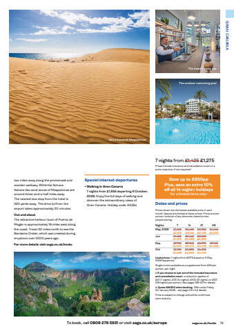 To book, call 0808 278 5931 or visit saga.co.uk/europe saga.co.uk/hscbc 75GRAN CANARIASand dunes of Maspalomas Caldera de BandamaThe hotel%u2019s lobby bar7 nights from %u00a31,425 %u00a31,275Prices include insurance and cancellation cover or a price reduction if not required%u00a7.Dates and pricesPrices shown are the lowest available price in each month. Spaces are limited at these prices. Prices are per person, inclusive of any discounts, based on two people sharing.Nights 7 14 21 28May, 2026 %u00a31,425- %u00a32,495- %u00a33,295- %u00a34,245-%u00a31,275 %u00a32,145 %u00a32,795 %u00a33,575Jun %u00a31,425- %u00a32,445- %u00a33,395-%u00a31,275 %u00a32,095 %u00a32,895Sep %u00a31,755- %u00a32,945- %u00a34,075- %u00a35,145-%u00a31,545 %u00a32,515 %u00a33,425 %u00a34,295Oct %u00a31,795- %u00a32,995- %u00a34,225-%u00a31,585 %u00a32,565 %u00a33,575Lead prices: 7 nights from %u00a31275 based on 5 May, 2026 departure.Single rooms available at a supplement from %u00a335 per person, per night%u00a7 If you choose to opt out of the included insurance and cancellation cover, a reduction applies of %u00a331%u00a0(7 nights), %u00a372 (14 nights), %u00a3102 (21 nights) or %u00a3137 (28 nights) per person. See pages 128-131 for details.# Quote SAVE10 when booking. Offer ends Friday 30 January 2026 - see page 3 for full details.Price is subject to change and will be confirmed upon enquiry.two miles away along the promenade and wooden walkway. While the famous Sahara-like sand dunes of Maspalomas are around three-and-a-half miles away. The nearest bus stop from the hotel is 220 yards away. The drive to/from the airport takes approximately 20 minutes.Out and aboutThe attractive harbour town of Puerto de Mog%u00e1n is approximately 18 miles west along the coast. Travel 30 miles north to see the Bandama Crater, which was created during eruptions over 2000 years ago.For more details visit saga.co.uk/hscbcThe outdoor swimming poolSpecial interest departures%u2022 Walking in Gran Canaria7 nights from %u00a31,855 departing 6 October, 2026. Enjoy five full days of walking and discover the extraordinary views of Gran%u00a0Canaria. Holiday code: AK354Save up to %u00a3850ppPlus, save an extra 10% off%u00a0all 14-night+ holidaysfor a limited time only#