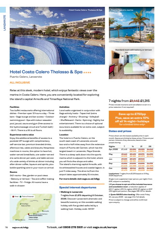 76 saga.co.uk/lz8gy To book, call 0808 278 5931 or visit saga.co.uk/europe LANZAROTEActivitiesLocal walks organised in conjunction with Saga activity hosts %u2022 Tapas trail (extra charge) %u2022 Archery %u2022 Shooting %u2022 Volleyball %u2022 Shuffleboard %u2022 Darts %u2022 Spinning %u2022 Nightly live entertainment. There is a choice of optional excursions available for an extra cost, subject to availability.LocationThe hotel is in Puerto Calero, on the south-east coast of Lanzarote, around two-and-a-half miles away from the extensive resort of Puerto del Carmen, which has the largest beach in Lanzarote, Playa Grande. There is a steep walk down into the sports marina which is adjacent to the hotel, where you will find a few shops and cafes. The island%u2019s charming capital Arrecife, with its whitewashed houses and coastal lagoon, is just 11 miles away. The drive to/from the airport takes approximately 15 minutes.For more details visit saga.co.uk/lz8gySpecial interest departures%u2022 Walking in Lanzarote7 nights from %u00a31,675 departing 6 October, 2026. Discover Lanzarote%u2019s dramatic and beautiful scenery on this sociable walking holiday with five guided walks led by a walking host. Holiday code:%u00a0AK13YFacilitiesTwo buffet restaurants offering international dishes %u2022 Free bar open 12 hours a day %u2022 Three bars %u2022 Saga lounge and bar access %u2022 Outdoor swimming pool %u2022 Spa with indoor seawater pool, jacuzzi, sauna and gym (free access to the hydromassage circuit and Turkish bath) %u2022 Wi-Fi. There is a lift to all floors.Experience extra valueEnjoy the additional benefits of access to a poolside VIP lounge with complimentary self-service bar, premium branded drinks, afternoon tea, cakes and biscuits, Nespresso machines in rooms, the option to have hot, waiter served breakfasts, one waiter-served %u00e1 la carte dinner per week, and table service of a wide variety of drinks at dinner including after dinner coffee, liqueurs and spirits, plus bottle sparkling wine in your room on arrival.Rooms342 rooms %u2022 Sea, garden or pool views %u2022 Balcony or terrace %u2022 Tea and coffee-making facilities %u2022 TV %u2022 Fridge. All rooms have a walk-in shower.Relax at this sleek, modern hotel, which enjoys fantastic views over the marina in Costa Calero. Here, you are conveniently located for exploring the island%u2019s capital Arrecife and Timanfaya National Park.Hotel Costa Calero Thalasso & Spa HHHHPuerto Calero, Lanzarote ALL INCLUSIVEPlaya BlancaArrecifeHotel Costa CaleroTalaso & SpaPuerto CaleroPuerto del CarmenTeguiseTimanfayaNational ParkLA N ZAR OTE7 nights from %u00a31,445 %u00a31,315Prices include insurance and cancellation cover or a price reduction if not required%u00a7.Dates and pricesPrices shown are the lowest available price in each month. Spaces are limited at these prices. Prices are per person, inclusive of any discounts, based on two people sharing.Nights 7 14 21 28Apr, 2026 %u00a31,445 %u00a32,395- %u00a33,325- %u00a34,245- %u00a32,345 %u00a33,195 %u00a34,065May %u00a31,445- %u00a32,425- %u00a33,375- %u00a34,295-%u00a31,315 %u00a32,125 %u00a32,875 %u00a33,645Jun %u00a31,455- %u00a32,425- %u00a33,345-%u00a31,325 %u00a32,125 %u00a32,845Sep %u00a31,595- %u00a32,695- %u00a33,695- %u00a34,725-%u00a31,445 %u00a32,365 %u00a33,145 %u00a33,995Oct %u00a31,625- %u00a32,745- %u00a33,775- %u00a34,845-%u00a31,475 %u00a32,415 %u00a33,225 %u00a34,095Lead prices: 7 nights from %u00a31,315 based on 5 May, 2026 departure.Single room supplement (per person, per night): from %u00a326, subject to availability%u00a7 If you choose to opt out of the included insurance and cancellation cover, a reduction applies of %u00a331%u00a0(7 nights), %u00a372 (14 nights), %u00a3102 (21 nights) or %u00a3137 (28 nights) per person. See pages 128-131 for details.# Quote SAVE10 when booking. Offer ends Friday 30 January 2026 - see page 3 for full details.Price is subject to change and will be confirmed upon enquiry.Puerto Calero%u2019s marinaStandard room with balcony or terraceHotel Costa Calero Thalasso & SpaHotel Point of interestSave up to %u00a3750ppPlus, save an extra 10% off%u00a0all 14-night+ holidaysfor a limited time only#