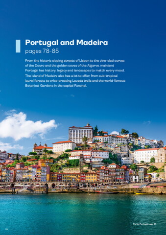 Portugal and Madeirapages 78-85From the historic sloping streets of Lisbon to the vine-clad curves of the Douro and the golden coves of the Algarve, mainland Portugal has history, legacy and landscapes to match every mood. The island of Madeira also has a lot to offer, from sub-tropical laurel forests to criss-crossing Levada trails and the world-famous Botanical Gardens in the capital Funchal. Porto, Portugal page 8178