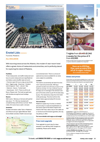 To book, call 0808 278 5931 or visit saga.co.uk/europe holiday code: madg2 83MADEIRAFacilitiesThree restaurants: one buffet restaurant and two %u00e1 la carte restaurants serving Madeiran and Italian cuisine (buffet-style at lunch) %u2022 Free bar open 24 hours a day across three bars %u2022 Saga lounge %u2022 Snack bar %u2022 Outdoor swimming pool %u2022 Gym %u2022 Jacuzzi %u2022 Spa %u2022 Solarium %u2022 Sauna %u2022 Turkish bath %u2022 Hairdresser %u2022 Wi-Fi. There is a lift to all floors. Please note: The hotel can get busy with families during the local holidays.Rooms348 rooms %u2022 Balcony or terrace with partial sea views %u2022 TV %u2022 Mini bar stocked with complimentary soft drinks on arrival %u2022 Bath robes. All rooms have a walk-in shower.ActivitiesGuided orientation walks Talk on Madeiran wine Movie and quiz nights Billiards Table tennis Water aerobics Health club and spa View of the sea from the hotel Outdoor diningStandard twin with balcony room7 nights from %u00a31,465 %u00a31,3454 weeks for the price of 3from %u00a33,595Prices include travel insurance and cancellation cover or a price reduction available if not required%u00a7.Dates and pricesPrices shown are the lowest available price in each month. Spaces are limited at these prices. Prices are per person, inclusive of any discounts, based on two people sharing.Nights 7 14 21 28Apr, 2026 %u00a31,495 %u00a32,495 %u00a33,425 %u00a34,375May %u00a31,515 %u00a32,475 %u00a33,425 %u00a34,325Jun %u00a31,515 %u00a32,525 %u00a33,425 %u00a34,345Sep %u00a31,545- %u00a32,525- %u00a33,425- %u00a34,295-%u00a31,415 %u00a32,275 %u00a33,075 %u00a33,845Oct %u00a31,575- %u00a32,545- %u00a33,495 %u00a34,445--%u00a31,445 %u00a32,295 %u00a33,145 %u00a33,945Nov %u00a31,515- %u00a32,495- %u00a33,595 %u00a33,595%u00a31,395 %u00a32,245Dec %u00a31,465- %u00a32,445 - %u00a33,545 %u00a34,695%u00a31,345 %u00a32,195Jan, 2027 %u00a31,545- %u00a32,525- %u00a33,695 %u00a33,695%u00a31,425 %u00a32,275Feb %u00a31,565- %u00a32,575- %u00a33,775 %u00a33,775%u00a31,445 %u00a32,325 Mar %u00a31,565- %u00a32,575- %u00a33,775 %u00a33,775%u00a31,445 %u00a32,325Lead prices: 7 nights from %u00a31,345 based on 15 December, 2026 departure. 4 weeks for the price of 3 from %u00a33,595 based on 24 Nov 2026. Other departures available between Nov 2-24 2026 and Jan 4-Mar 2, 2027Limited number of sole occupancy rooms at no extra cost, after which a supplement may apply, subject to availability. Please note special offers are not applicable on single rooms without supplement%u00a7 If you choose to opt out of the included insurance and cancellation cover, a reduction applies of %u00a331%u00a0(7 nights), %u00a372 (14 nights), %u00a3102 (21 nights) or %u00a3137 (28 nights) per person. See pages 48-51 for details.# Quote SAVE10 when booking. Offer ends Friday 30 January 2026 - see page 3 for full details.Price is subject to change and will be confirmed upon enquiry.With stunning views across the Atlantic, this modern 5-star resort hotel offers a great choice of restaurants and amenities, and is perfectly placed for exploring the island of Madeira.Enotel Lido HHHHHFunchal, MadeiraALL INCLUSIVELive entertainment. There is a choice of optional excursions available for an extra cost, subject to availability.LocationThe hotel is conveniently set back from the main road and promenade, offering a peaceful location but with easy access to the seafront and lido. It is also perfectly placed for days out or evenings in the old town and port of Funchal, which is just 10 minutes away by bus. The nearest bus stop from the hotel is 50 yards away. The drive to/from the airport takes approximately 30 minutes.Out and aboutMadeira%u2019s capital city, Funchal, is nestled around a bay in a natural amphitheatre on the south coast of the island. Explore the historic Old Town, take a trip on the cable car or stroll around the botanic gardens, the city has plenty on offer.For more details visit saga.co.uk/madg2Free room upgradeFree upgrade to a pool view for stays between 2 Jan-28 Feb, 2027. Subject to availability. Please call for details.A T L A N T I CO C E A NEnotel LidoFunchalPico Ruivo(1640m) (1862m)MADEIRACanicoMachicoSanto de SerraAssomadaNun%u2019s Valley TrailBoca dos Namorados%u2022No single supplementHotel Point of interestSave up to %u00a3500ppPlus, save an extra 10% off%u00a0all 14-night+ holidaysfor a limited time only#
