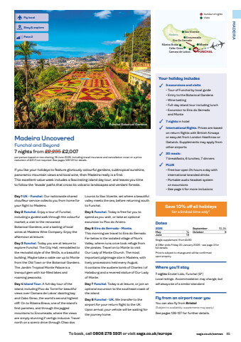 To book, call 0808 278 5931 or visit saga.co.uk/europe saga.co.uk/semws 85MADEIRAYour holiday includes%u2022 5 excursions and visits%u2022 Tour of Funchal by local guide%u2022 Entry to the Botanical Gardens%u2022 Wine tasting%u2022 Full-day island tour including lunch%u2022 Excursion to Eira do Serrado and Monte%u2022 7 nights in hotel%u2022 International flights. Prices are based on return flights with British Airways or easyJet from London Heathrow or Gatwick. Supplements may apply from other airports%u2022 20 meals:7 breakfasts, 6 lunches, 7 dinners %u2022 PLUS%u2022 Free bar open 24 hours a day with international branded drinks%u2022 Portable audio headset system on excursions%u2022 See page 4 for more inclusionsDates2026May 14June 18September 10, 24October 8Single supplement: from %u00a3450# Offer ends Friday 30 January 2026 - see page 3 for full details.Price is subject to change and will be confirmed upon enquiry.Louros to Sao Vicente, set where a beautiful valley meets the sea, before returning south to Funchal.Day 5 Funchal. Today is free for you to spend as you wish, or take an optional excursion to Pico do Arieiro.Day 6 Eira do Serrado - Monte.This morning we travel to Eira do Serrado. Far below is the isolated village of Nun%u2019s Valley, where nuns once took refuge from the pirates. Travel on to Monte to visit Our Lady of Monte Church. The most important pilgrimage site in Madeira, with lively processions held every August. It contains the austere tomb of Charles I of Habsburg and a revered statue of Our Ladyof Monte.Day 7 Funchal. Today is at leisure, or join an optional excursion to the southeast coast of the island.Day 8 Funchal - UK. We transfer to the airport for your return flight to the UK. Upon arrival, your vehicle will be waiting for the journey home.Day 1 UK - Funchal. Our nationwide shared chauffeur service collects you from home for your flight to Madeira.Day 2 Funchal. Enjoy a tour of Funchal, including a guided walk through the colourful market; a visit to the renowned Botanical Gardens; and a tasting of local wines at Madeira Wine Company. Enjoy the afternoon at leisure.Day 3 Funchal. Today you are at leisure to explore Funchal. The City Hall, remodelled to the revivalist style of the 1940s, is a beautiful building. Maybe take a cable car up to Monte from the Old Town or the Botanical Gardens. The Jardim Tropical Monte Palace is a tranquil gem with koi-filled lakes and roaming peacocks.Day 4 Island Tour. A full-day tour of the island, including Pico da Torre for beautiful views over Camara de Lobos%u2019 dazzling bay and Cabo Girao, the world%u2019s second highest cliff. On to Ribeira Brava, one of the island%u2019s first parishes, and through the jagged mountains to Encumeada, where the views are simply stunning if vertigo inducive. Travel north on a scenic drive through Chao dos 7FUNCHALMonteCamara de LobosCabo GiraoRibeira BravaEncumeadaSao VicenteEira Do SerradoMadeira7Funchal Botanical GardensIf you like your holidays to feature gloriously colourful gardens, subtropical sunshine, panoramic mountain views and local wine, then Madeira really is a find. This excellent-value week includes a fascinating island day tour, and leaves you time to follow the %u2018levada%u2019 paths that cross its volcanic landscapes and verdant forests.Madeira UncoveredFunchal and Beyond7 nights from %u00a32,235 %u00a32,007per person based on two sharing, 18 June 2026. Including travel insurance and cancellation cover or a price reduction of %u00a331 if not required. See pages 128-131 for details.Stay & exploreFly localPace 2Where you%u2019ll stay7 nights Enotel Lido, Funchal (5*)Local ratings. Accommodation may change, but will always be of a similar standard.Fly from an airport near youYou can also fly from Bristol(Subject to availability, supplements may apply.)See pages 126-127 for further details.Save 10% off all holidaysfor a limited time only#1 Number of nightsVisits