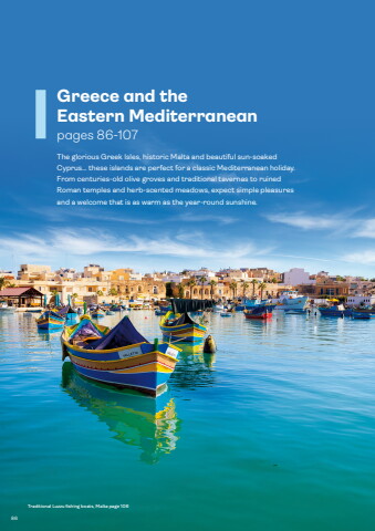 Greece and the Eastern%u00a0Mediterraneanpages 86-107The glorious Greek Isles, historic Malta and beautiful sun-soaked Cyprus%u2026 these islands are perfect for a classic Mediterranean holiday. From centuries-old olive groves and traditional tavernas to ruined Roman temples and herb-scented meadows, expect simple pleasures and a welcome that is as warm as the year-round sunshine. Traditional Luzzu fishing boats, Malta page 10686
