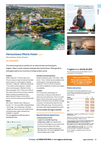 To book, call 0808 278 5931 or visit saga.co.uk/europe saga.co.uk/hsaer 87CRETEDates and pricesPrices shown are the lowest available price in each month. Spaces are limited at these prices. Prices are per person, inclusive of any discounts, based on two people sharing.Nights 7 14Apr, 2026 %u00a31,525- %u00a32,395- %u00a31,365 %u00a32,065May %u00a31,575- %u00a32,495- %u00a31,415 %u00a32,165Jun %u00a31,795- %u00a32,895- %u00a31,585 %u00a32,495Sep %u00a31,595- %u00a32,525- %u00a31,435 %u00a32,195Oct %u00a31,515- %u00a32,425- %u00a31,355 %u00a32,095Lead prices: 7 nights from %u00a31355 based on 7 October, 2026 departure.Single room supplement (per person, per night): from %u00a330-%u00a353 depending on departure date%u00a7 If you choose to opt out of the included insurance and cancellation cover, a reduction applies of %u00a331%u00a0(7 nights), %u00a372 (14 nights), %u00a3102 (21 nights) or %u00a3137 (28 nights) per person. See pages 128-131 for details.# Quote SAVE10 when booking. Offer ends Friday 30 January 2026 - see page 3 for full details.Price is subject to change and will be confirmed upon enquiry.Save up to %u00a3400ppPlus, save an extra 10% off%u00a0all 14-night+ holidaysfor a limited time only#Activities and entertainmentGuided orientation walks %u2022 Pool table %u2022 Table tennis %u2022 Tennis %u2022 Water sports available at the nearby beach %u2022 Evening entertainment (seasonal). There is a choice of optional excursions available for an extra cost, subject to availability.LocationA 10-minute drive will bring you to Hersonissos, a lively town with plenty of cafes, bars and restaurants. There is a small beach in front of the hotel, but you will find others in the resort if you would like a change of scenery. The nearest bus stop from the hotel is 200 yards away. The drive to/from the airport takes approximately 30 minutes.For more details visit saga.co.uk/hsaerSpecial interest departures%u2022 Food and wine in Crete7 nights from %u00a32,265 departing 9 September, 2026. Join MasterChef winner Irini Tzortzoglou as your expert host as she shares her passion for Greek flavours. Learn to make and taste local specialities plus visit some highlights of the island. Holiday code: AL460FacilitiesBuffet restaurant %u2022 Free bar open up to 13 hours a day serving international branded spirits, liqueurs, a wide range of cocktails, and wines %u2022 Lobby bar %u2022 Beach bar (seasonal) %u2022 Two outdoor swimming pools %u2022 Heated indoor swimming pool %u2022 Wellness Centre (fees may apply) %u2022 Wi-Fi. There are no lifts at this hotel, however there are only a couple of steps to the bar and restaurant, and approximately 16 steps to second floor rooms. There are ramps around the grounds.Rooms204 rooms %u2022 Garden views %u2022 Balcony or terrace %u2022 TV %u2022 Tea and coffee-making facilities %u2022 Mini fridge %u2022 Air conditioning %u2022 Hairdryer %u2022 Telephone. Most rooms have a bath with an overhead shower (walk-in showers are available on request).You can upgrade to a side-sea view or shared pool roomThis welcoming hotel is perfect for an island break overlooking the Aegean. Stay in white-washed buildings adorned by flower-filled gardens, while giant palms surround two inviting outdoor pools.Hersonissos Maris Hotel HHHHHersonissos, Crete, GreeceALL INCLUSIVEM O U N T A I NHeraklionHersonissos Maris HotelHersonissos KnossosAgios NikolaosFodeleRethymno L A2147 S I T H I P L A T E A UCRETE7 nights from %u00a31,515 %u00a31,355Prices include insurance and cancellation cover or a price reduction if not required%u00a7.Join Chef Irini Tzortzoglou on our special%u00a0interest departureA garden view roomAerial view of Hersonissos Maris HotelHotel Point of interest