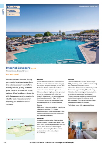 88 To book, call 0808 278 5931 or visit saga.co.uk/europeCRETEFacilitiesTwo buffet restaurants and one traditional Greek %u00e0 la carte restaurant (extra charge). On stays of 14 nights or longer, you can dine for free in the %u00e0 la carte restaurant once a week %u2022 Four bars %u2022 Free bar open up to 13 hours a day serving local drinks (premium drinks for guests staying 21 nights and longer) %u2022 Saga lounge %u2022 Six swimming pools (one heated seasonally) %u2022 Gym %u2022 Wi-Fi. The hotel is spread across multiple levels, some accessible by lift, others by stairs.Rooms330 rooms in the main building %u2022 Inland views %u2022 Balcony or terrace %u2022 TV %u2022 Fridge %u2022 Air-conditioning %u2022 Most rooms have a bath with an overhead shower (walk-in showers are available on request).ActivitiesGuided orientation walks %u2022 Aqua aerobics %u2022 Yoga %u2022 Zumba %u2022 Tennis %u2022 Table tennis %u2022 Mini golf %u2022 Darts %u2022 Nightly entertainment with live music, dance shows and theme nights. There is a choice of optional excursions available for an extra cost, subject to availability.LocationThe nearest beach is located down a slope, 550 yards away, which can be accessed using the hotel%u2019s regular shuttle service. The centre of Hersonissos, with its shops and tavernas, is approximately 875 yards away. While the charming village of Koutouloufari is around three-quarters-of-a-mile away. There is bus stop outside the hotel with links to the island%u2019s capita Heraklion, around 20 miles away. The drive to/from the airport takes approximately 40 minutes.To find out more visit saga.co.uk/hsbreWith an elevated seafront setting surrounded by attractive gardens, this extensive resort hotel offers friendly service, quality, and has a great range of facilities and dining options. It has long been a favourite with Saga guests, and its location is ideal for both relaxation and for exploring the attractive island of Crete.M O U N T A I NHeraklionImperial BelvedereHersonissos KnossosAgios NikolaosFodeleRethymno L A2147 S I T H I P L A T E A UCRETEViews across the outdoor poolStandard sea-view roomImperial Belvedere HHHHHersonissos, Crete, Greece ALL INCLUSIVE%u2022No single supplement%u2022Solo date%u2022New hotelHotel Point of interest