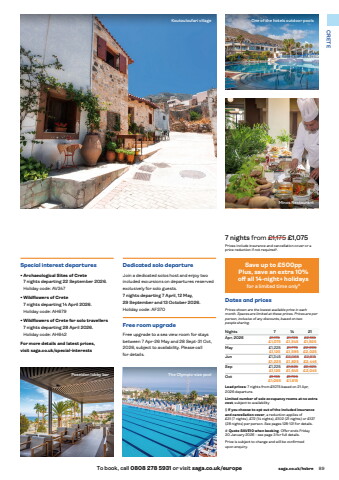 To book, call 0808 278 5931 or visit saga.co.uk/europe saga.co.uk/hsbre 89CRETEKoutouloufari village One of the hotels outdoor poolsMinos RestaurantPoseidon lobby bar The Olympic-size pool7 nights from %u00a31,175 %u00a31,075Prices include insurance and cancellation cover or a price reduction if not required%u00a7.Dates and pricesPrices shown are the lowest available price in each month. Spaces are limited at these prices. Prices are per person, inclusive of any discounts, based on two people sharing.Nights 7 14 21Apr, 2026 %u00a31,175- %u00a31,725- %u00a32,195- %u00a31,075 %u00a31,545 %u00a31,925May %u00a31,225 %u00a31,775- %u00a32,295- %u00a31,125 %u00a31,595 %u00a32,025Jun %u00a31,345 %u00a32,065- %u00a32,815- %u00a31,225 %u00a31,825 %u00a32,445Sep %u00a31,225 %u00a31,825- %u00a32,325- %u00a31,125 %u00a31,645 %u00a32,045Oct %u00a31,195- %u00a31,795- %u00a31,095 %u00a31,615Lead prices: 7 nights from %u00a31075 based on 21 Apr, 2026 departure.Limited number of sole occupancy rooms at no extra cost, subject to availability%u00a7 If you choose to opt out of the included insurance and cancellation cover, a reduction applies of %u00a331%u00a0(7 nights), %u00a372 (14 nights), %u00a3102 (21 nights) or %u00a3137 (28 nights) per person. See pages 128-131 for details.# Quote SAVE10 when booking. Offer ends Friday 30 January 2026 - see page 3 for full details.Price is subject to change and will be confirmed upon enquiry.Special interest departures%u2022 Archaeological Sites of Crete7 nights departing 22 September 2026.Holiday code: AV347%u2022 Wildflowers of Crete7 nights departing 14 April 2026.Holiday code: AH679%u2022 Wildflowers of Crete for solo travellers7 nights departing 28 April 2026.Holiday code: AH642For more details and latest prices,visit%u00a0saga.co.uk/special-interestsDedicated solo departureJoin a dedicated solos host and enjoy two included excursions on departures reserved exclusively for solo guests.7 nights departing 7 April, 12 May, 29 September and 13 October 2026. Holiday code: AF370Free room upgradeFree upgrade to a sea view room for stays between 7 Apr-26 May and 28 Sept-31 Oct, 2026, subject to availability. Please call for details.Save up to %u00a3500ppPlus, save an extra 10% off%u00a0all 14-night+ holidaysfor a limited time only#