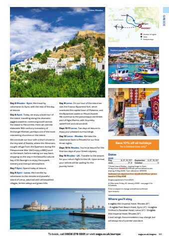 To book, call 0808 278 5931 or visit saga.co.uk/europe saga.co.uk/segms 93GREECERHODES*LerosSymiTurkey Greek Islands437Dates2026May 2, 6*, 16, 20*June 3*, 6September 5, 9*, 19, 23*October 3* Greek Island Medley - staying longer in Symi.15 days from %u00a32,995 %u00a32,678 per person based on two sharing, 6 May 2026. Tour reference: SEGMWDedicated solo departure from %u00a33,395 %u00a33,038 per person based on 2 May 2026Single supplement: from %u00a3520# Offer ends Friday 30 January 2026 - see page 3 for full details.Price is subject to change and will be confirmed upon enquiry.Lindos, RhodesExplore peaceful LerosCharming SymiUNESCO-protected RhodesWhere you%u2019ll stay4 nights Akti Imperial Hotel, Rhodes (5*) %u2022 3 nights Pedi Beach Hotel, Symi (4*) %u2022 4 nightsCrithoni%u2019s Paradise Hotel, Leros (4*) %u2022 3 nightsAkti Imperial Hotel, Rhodes (5*)Local ratings. Accommodation may change, but will always be of a similar standard.Day 5 Rhodes - Symi. We travel by catamaran to Symi, with the rest of the day at leisure.Day 6 Symi. Today, we enjoy a boat tour of the island, travelling along the dramatic jagged coastline, continuing south across the island to Panormitis. Here we visit the elaborate 18th-century monastery of Archangel Michael, perhaps one of the most interesting churches on the island.We conclude our tour with a short cruise to the tiny islet of Sesklia, where the Athenians sought refuge from the Spartans during the Peloponnese War. We%u2019ll enjoy a BBQ lunch on the beach, before making our way back, stopping on the way in the beautiful natural bay of St George%u2019s to enjoy the superb scenery and tranquil atmosphere.Day 7 Symi. Spend today at leisure.Day 8 Symi - Leros. We transfer by catamaran to the remote and peaceful island of Leros, adorned with whitewashed villages, fertile valleys and green hills.1 Number of nightsVisits* Multiple staysSave 10% off all holidaysfor a limited time only#Day 9 Leros. On our tour of the island we visit the Franco-Byzantine fort, which overlooks the capital town of Platanos, and the Byzantine castle on Mount Kasteli. We continue to the picturesque old Greek port of Agia Marina, with its pretty waterfront and old windmill.Days 10-11 Leros. Two days at leisure to enjoy your pleasant surroundings.Day 12 Leros - Rhodes. We take the catamaran back to Rhodes for our final three nights.Days 13-14 Rhodes. You%u2019re at leisure for the final two days of your Greek odyssey.Day 15 Rhodes - UK. Transfer to the airport for your return flight to the UK. Upon arrival, your vehicle will be waiting for the journey home.