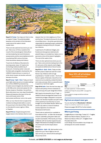To book, call 0808 278 5931 or visit saga.co.uk/europe saga.co.uk/secrn 25CROATIADates2026April 13May 11September 7, 21October 5No single supplement - limited availability# Offer ends Friday 30 January 2026 - see page 3 for full details.Price is subject to change and will be confirmed upon enquiry.Where you%u2019ll stay4 nights Bluesun Hotel Alga, Tu%u010depi (4*) %u2022 7 nightsWaterman Resort Kaktus, Supetar (4*) or Waterman Resort, Milna (4*) %u2022 3 nights Hotel President Solin (5*)Local ratings. Accommodation may change, but will always be of a similar standard.Days 2-4 Tu%u010depi. Your days are free to relax or explore Tu%u010depi. The polished pebble beaches on this stretch of the Dalmatian coast ensure the waters remain crystal-clear.There are also optional excursions you can join. Take a tour of Omis, located at the mouth of the emerald-green Cetina Riverand dominated by lost world limestone escarpments and the stone battlements of a mountaintop 15th-century fortress. Omis has drama, beauty and history.Travel into the Biokovo Mountains for stunning ocean views. Or head to the enchanting medieval walled city of Dubrovnik. Circled by butter-coloured fortified walls and golden city beaches, the UNESCO-listed old town is a warren of white-stone houses, terracotta roofs and baroque churches.Day 5 Tu%u010depi - Split - Bra%u010d. Today we travel up to Split where we join an included walking tour of this UNESCO-protected city. Croatia%u2019s second largest city started out life in AD 295 as the retirement palace for the Roman emperor, Diocletian. Carved from Bra%u010d white stone (our next stop) Diocletian%u2019s Palace still stands at the heart of the old town and houses some of the best-preserved Roman ruins in the world.After our tour there%u2019s time to explore the medieval winding streets before a scenic ferry journey to the island of Bra%u010d. We stay on the island for seven nights in Milna or Supetar.Days 6-11 Bra%u010d. Despite being the third largest island in the Adriatic, Bra%u010d is much sleepier than its A-list neighbours of Hvar and Kor%u010dula. The island is famous for its olive oil and Bra%u010d stone - the white quarried stone responsible for keeping Europe%u2019s cathedrals and palaces looking so shiny for the past two millennia.A patchwork of traditional villages, pine forests and olive groves indented with peaceful bays, an included tour takes us on a panoramic drive of the island%u2019s highlights. The rest of the week is free.There are also optional excursions you can join. Take a wine and olive tasting trip to Dol. Or visit some of the island%u2019s small villages and pastoral settlements of stone houses.Day 12 Bra%u010d - Split - Solin. Today we take the ferry back to Split and visit the ruined Roman city of Salona with its huge amphitheatre. Transfer to Solin - the former Roman capital of Dalmatia. Inland from the coast and surrounded by verdant farmland and rocky outcrops, Solin is a peaceful oasis to spend our last three nights.Days 13-14 Solin. Over the next two days, we explore with plenty of time in between to relax and enjoy the quiet village feel of Solin.We%u2019ll head to the beautiful city of Trogir - a UNESCO World Heritage Site linked to the mainland by bridges. Wrapped in turquoise waters, the Venetian fa%u00e7ades and palm trees of the waterfront look like they%u2019ve come straight out of the Italian Riviera. Within the ancient city walls is a maze of medieval streets, Byzantine churches and Renaissance bell towers.There%u2019s also an optional tour available to Krka National Park - an Eden-like landscape of seven waterfalls, jade-green lakes and wooden boardwalks. Afterwards you%u2019ll stop at %u0160ibenik with terracotta-topped houses, elegant Renaissance buildings and Gothic churches built into the slopes above the port.Day 15 Solin - Split - UK. We transfer to the airport for your return flight to the UK. Upon arrival, your vehicle will be waiting for the journey home.SPLITTucepiBracSolin47Croatia3Trogir UNESCO-protected TrogirSplit HarbourDiscover picturesque SolinFly from an airport near youYou can also fly from Manchester & Bristol(Subject to availability, supplements may apply.)Please see pages 126-127 for further details.1 Number of nightsVisitsSave 10% off all holidaysfor a limited time only#