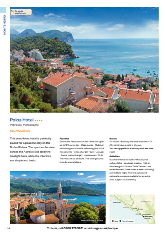 28 To book, call 0808 278 5931 or visit saga.co.uk/europeMONTENEGROFacilitiesTwo buffet restaurants %u2022 Bar %u2022 Free bar open up to 12 hours a day %u2022 Saga lounge %u2022 Outdoor swimming pool %u2022 Indoor swimming pool %u2022 Spa (treatments %u2013 extra charge) %u2022 Gym %u2022 Jacuzzi %u2022 Sauna (extra charge) %u2022 Hairdresser %u2022 Wi-Fi. There is a lift to all floors. The hotel grounds include several steps.Rooms171 rooms %u2022 Balcony with side-sea view %u2022 TV. All rooms have a walk-in shower.You can upgrade to a balcony with sea view roomActivitiesGuided orientation walks %u2022 History and culture talks %u2022 Language lessons %u2022 Talk on Montenegrin Culture %u2022 Table Tennis %u2022 Live entertainment three times a week, including one folklore night. There is a choice of optional excursions available for an extra cost, subject to availability.This beachfront hotel is perfectly placed for a peaceful stay on the Budva Riviera. The spectacular view across the Adriatic Sea steal the limelight here, while the interiors are simple and basic.Palas Hotel HHHHPetrovac, MontenegroALL INCLUSIVEThe coastal town of PetrovacHistoric town of BudvaTivat KotorSveti StefanHotel PalasPetrovacBudvaDubrovnik MO N TE N EGROCROATIAHotel Point of interest%u2022No single supplement