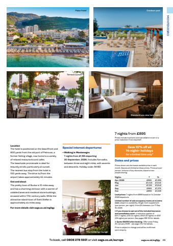 To book, call 0808 278 5931 or visit saga.co.uk/europe saga.co.uk/mg3gy 29MONTENEGROSave 10% off all 14-night+%u00a0holidaysfor a limited time only#7 nights from %u00a3895Prices include insurance and cancellation cover or a price reduction if not required%u00a7.Dates and pricesPrices shown are the lowest available price in each month. Spaces are limited at these prices. Prices are per person, inclusive of any discounts, based on two people sharing.Nights 7 14Apr, 2026 %u00a3955 %u00a31,365May %u00a31,045 %u00a31,545Jun %u00a31,125 %u00a31,645Sep %u00a3995 %u00a31,375Oct %u00a3895 %u00a31,325Lead prices: 7 nights from %u00a3895 based on 14 October 2026 departure.Limited number of sole occupancy rooms at no extra cost, subject to availability. Single room supplement (per person, per night): from %u00a314 between Jun 17-Sep 16, 2026%u00a7 If you choose to opt out of the included insurance and cancellation cover, a reduction applies of %u00a331%u00a0(7 nights), %u00a372 (14 nights), %u00a3102 (21 nights) or %u00a3137 (28 nights) per person. See pages 128-131 for details.# Quote SAVE10 when booking. Offer ends Friday 30 January 2026 - see page 3 for full details.Price is subject to change and will be confirmed upon enquiry.LocationThe hotel is positioned on the beachfront and 600 yards from the old port of Petrovac, a former fishing village, now home to a variety of relaxed restaurants and cafes. The beachside promenade is ideal for leisurely strolls, particularly at sunset. The nearest bus stop from the hotel is 100 yards away. The drive to/from the airport takes approximately 45 minutes.Out and aboutThe pretty town of Budva is 10 miles away and has a charming old town with a warren of cobbled lanes and medieval stone buildings, encased within 17th-century walls. While the attractive island-town of Sveti Stefan is approximately six miles away.For more details visit saga.co.uk/mg3gySveti StefanTerrace sunsetPalas HotelSpecial interest departures%u2022 Walking in Montenegro7 nights from %u00a31,195 departing 30 September, 2026. Includes%u00a0five walks, between three and eight miles, with ascents and descents. Holiday code: AK183The lobby bar loungeStandard sea view twin roomOutdoor pool