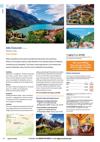 32 saga.co.uk/il7g1 To book, call 0808 278 5931 or visit saga.co.uk/europe ITALYsetting overlooking the beautiful, blue waters of Lake Molveno, backed by the Dolomites. At one end of the lake, around 435 yards away, the pretty town of Molveno beckons, offering small beaches perfect for swimming and boating. Meanwhile, verdant forests and winding pathways surround the seven-mile shoreline, making it a paradise for nature lovers. The drive to/from the airport takes approximately two hours.For more details visit saga.co.uk/il7g1Special interest departures%u2022 Walking in the Italian Dolomites7 nights from %u00a31,325 departing 28 September, 2026. Holiday code: AK136%u2022 Food and Wine in the Dolomites7 nights from %u00a31,575 departing 21 September, 2026. Holiday code: AL136FacilitiesRestaurant %u2022 Lounge bar %u2022 Outdoor swimming pool %u2022 Spa %u2022 Jacuzzi %u2022 Sauna %u2022 Library %u2022 Wi-Fi. There is a lift to all floors, however, the local area is not suitable for wheelchair users or guests with mobility due to the steep terrain.Rooms40 rooms %u2022 Balcony (with garden or mountain view) %u2022 TV %u2022 Kettle %u2022 Air conditioning. All rooms have a walk-in shower.ActivitiesGuided orientation walks %u2022 Talk on local food and drink %u2022 Language class. There is a choice of optional excursions available for an extra cost, subject to availability.LocationThe surrounding area is particularly hilly, with very steep inclines from the hotel up to the village. Alle Dolomiti has a particularly scenic With a backdrop of the pink-hued Brenta Dolomites, this authentic, family-run boutique hotel on Lake Molveno is the perfect blend of tradition, modernity and hospitality. The hotel%u2019s charming interior is furnished with natural materials, many of which were crafted by local artisans.Alle Dolomiti HHHHMolveno, ItalyHALF BOARD 7 nights from %u00a31,125Prices include insurance and cancellation cover or a price reduction if not required%u00a7.Dates and pricesPrices shown are the lowest available price in each month. Spaces are limited at these prices. Prices are per person, inclusive of any discounts, based on two people sharing.Nights 7 14May %u00a31,195 %u00a31,825- %u00a31,775Jun %u00a31,125 %u00a31,775- %u00a31,725Sep %u00a31,125 %u00a31,825- %u00a31,775Lead prices: 7 nights from %u00a31,125 based on 22 June, 2026 departure.Single room supplement (per person, per night): from%u00a0%u00a34%u00a7 If you choose to opt out of the included insurance and cancellation cover, a reduction applies of %u00a331%u00a0(7 nights), %u00a372 (14 nights), %u00a3102 (21 nights) or %u00a3137 (28 nights) per person. See pages 128-131 for details.# Quote SAVE10 when booking. Offer ends Friday 30 January 2026 - see page 3 for full details.Price is subject to change and will be confirmed upon enquiry.TrentoLake GardaAlle DolomitiLake MolvanoBolzanoCarezzaMeranoVeronaD O L O M I T E SITALYS W I T Z E R L A N DLake MolvenoBrenta DolomitesHotel Alle DolomitiView of the Brenta DolomitesA standard bedroomHotelPoint of interestSave up to %u00a350ppPlus, save an extra 10% off%u00a0all 14-night+ holidaysfor a limited time only#