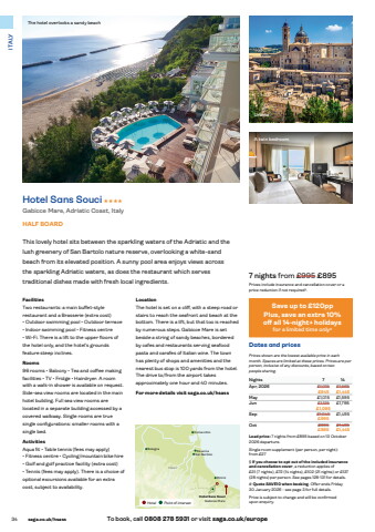 34 saga.co.uk/hsass To book, call 0808 278 5931 or visit saga.co.uk/europe ITALYLocationThe hotel is set on a cliff, with a steep road or stairs to reach the seafront and beach at the bottom. There is a lift, but that too is reached by numerous steps. Gabicce Mare is set beside a string of sandy beaches, bordered by cafes and restaurants serving seafood pasta and carafes of Italian wine. The town has plenty of shops and amenities and the nearest bus stop is 100 yards from the hotel. The drive to/from the airport takes approximately one hour and 40 minutes.For more details visit saga.co.uk/hsassFacilitiesTwo restaurants: a main buffet-style restaurant and a Brasserie (extra cost) %u2022 Outdoor swimming pool %u2022 Outdoor terrace %u2022 Indoor swimming pool %u2022 Fitness centre %u2022 Wi-Fi. There is a lift to the upper floors of the hotel only, and the hotel%u2019s grounds feature steep inclines.Rooms96 rooms %u2022 Balcony %u2022 Tea and coffee making facilities %u2022 TV %u2022 Fridge %u2022 Hairdryer. A room with a walk-in shower is available on request. Side-sea view rooms are located in the main hotel building. Full sea view rooms are located in a separate building accessed by a covered walkway. Single rooms are true single configurations: smaller rooms with a single bed.ActivitiesAqua fit %u2022 Table tennis (fees may apply) %u2022 Fitness centre %u2022 Cycling/mountain bike hire %u2022 Golf and golf practice facility (extra cost) %u2022 Tennis (fees may apply). There is a choice of optional excursions available for an extra cost, subject to availability.7 nights from %u00a3995 %u00a3895Prices include insurance and cancellation cover or a price reduction if not required%u00a7.Dates and pricesPrices shown are the lowest available price in each month. Spaces are limited at these prices. Prices are per person, inclusive of any discounts, based on two people sharing.Nights 7 14Apr, 2026 %u00a31,015- %u00a31,565- %u00a3945 %u00a31,445May %u00a31,015 %u00a31,595Jun %u00a31,125- %u00a31,795 %u00a31,095Sep %u00a31,045- %u00a31,495 %u00a3995Oct %u00a3995- %u00a31,495- %u00a3895 %u00a31,445Lead price: 7 nights from %u00a3895 based on 13 October 2026 departure.Single room supplement (per person, per night): from%u00a0%u00a327%u00a7 If you choose to opt out of the included insurance and cancellation cover, a reduction applies of %u00a331%u00a0(7 nights), %u00a372 (14 nights), %u00a3102 (21 nights) or %u00a3137 (28 nights) per person. See pages 128-131 for details.# Quote SAVE10 when booking. Offer ends Friday 30 January 2026 - see page 3 for full details.Price is subject to change and will be confirmed upon enquiry.This lovely hotel sits between the sparkling waters of the Adriatic and the lush greenery of San Bartolo nature reserve, overlooking a white-sand beach from its elevated position. A sunny pool area enjoys views across the sparkling Adriatic waters, as does the restaurant which serves traditional dishes made with fresh local ingredients.Hotel Sans Souci HHHHGabicce Mare, Adriatic Coast, ItalyHALF BOARDHotel Sans SouciGabicce MareComacchioRiminiRavennaSan BartoloBolognaITALYS A N M A R I N OUrbinoA twin bedroomThe hotel overlooks a sandy beachHotel Point of interestSave up to %u00a3120ppPlus, save an extra 10% off%u00a0all 14-night+ holidaysfor a limited time only#