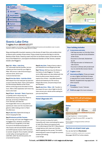To book, call 0808 278 5931 or visit saga.co.uk/europe saga.co.uk/seils 35ITALYYour holiday includes%u2022 4 excursions and visits%u2022 Half-day excursion to Orta San Giulio, boat trip to Isola San Giulio & Basilica di San Giulio%u2022 Excursion to Zermatt, Switzerland by%u00a0rail %u2022 Half-day excursion to Verbania and Villa Taranto%u2022 Excursion to Stresa with private boat tour to visit the Borromean Islands%u2022 7 nights in hotel%u2022 International flights. Prices are based on return flights with British Airways or easyJet from London Heathrow or Gatwick. Supplements may apply from other airports%u2022 15 meals:7 breakfasts, 1 lunch, 7 dinners %u2022 PLUS see page 4 for more inclusionsDates2026April 21May 5, 19June 2, 16September 15, 29Dedicated solo departure from %u00a33,035 %u00a32,727 per person based on 21 April 2026No Single Supplement - Limited Availability# Offer ends Friday 30 January 2026 - see page 3 for full details.Price is subject to change and will be confirmed upon enquiry.Hotel L%u2019Approdo (4*)Take a moment to enjoy the hotel%u2019s tranquillity with views overlooking the waters of Lake Orta. Rooms are spacious with air-conditioning and free Wi-Fi. Many feature a large balcony with views over the lake - ideal for gazing into the sunset. The hotel%u2019s swimming pool is open through the summer, weather permitting.Local ratings. Day 6 Lake Orta. Today is free to relax in your beautiful surroundings by the lake.Day 7 Stresa. We%u2019ll journey into Stresa on the banks of Lake Maggiore. The lake%u2019s wind-ruffled waters are also dotted with the three tiny Borromean Islands and we%u2019ll explore two of them - Isola Bella (beautiful island) dominated by its 17th-century Palazzo Borromeo, and picturesque Isola dei Pescatori.Day 8 Lake Orta - Milan - UK. Transfer to the airport for your return flight to the UK. Upon arrival, your vehicle will be waiting for your journey home.Day 1 UK - Milan - Lake Orta.Our nationwide shared chauffeur service collects you from home for your flight to Milan. We arrive in Lake Orta and enjoy a welcome drink, dinner and musical entertainment.Day 2 Orta San Giulio - Isola San Giulio.We%u2019ll depart from the hotel pier by boat and cruise to Isola San Giulio. There, we%u2019ll explore the Romanesque Basilica di San Giuliobefore continuing across the water to Orta town. After a little exploration we%u2019ll return by boat to the hotel.Day 3 T%u00e4sch - Zermatt - T%u00e4sch. Experience a superbly scenic rail journey into Switzerland as we journey from T%u00e4sch to Zermatt, at the foot of Matterhorn. From Zermatt, we%u2019ll take the Gornergrat Bahn line to a view point for spectacular views over the mountains and glaciers, before taking a train to T%u00e4sch this afternoon.Day 4 Lake Orta. Spend the full day at leisure enjoying the lake.Day 5 Verbania and Villa Taranto.This morning, we%u2019ll visit Lake Maggiore and its biggest town, Verbania, sometimes referred to as %u2018the garden on the lake%u2019. It%u2019s home to the Botanical Gardens of Villa Taranto with almost 20,000 varieties and 3,000 species of plant. We%u2019ll have time to wander along the 7kms of paths, taking in a small valley, terraced gardens and waterfalls, water lily and lotus pools, and ornamental fountains.MILANT%u00e4schPettenascoZermattStresaSwitzerlandItaly7VerbaniaSan Giulio IslandZermattStay amid beautiful mountain scenery on the shores of Lake Orta, and combine time at leisure with a variety of excursions. Enjoy a boat trip across the lake to visit the Basilica di San Giulio, travel by coach and train to the Swiss resort of Zermatt at the foot of the Matterhorn, and explore the Botanical Gardens of Villa Taranto, nestled beside Lake Maggiore.Scenic Lake Orta7 nights from %u00a32,535 %u00a32,277 per person based on two sharing, 2 June 2026. Including travel insurance and cancellation cover or a price reduction of %u00a331 if not required. See pages 128-131 for details.Stay & exploreRail journeySolo dateFly localPace 1Fly from an airport near youYou can also fly from Manchester(Subject to availability, supplements may apply.)See pages 126-127 for further details.No single supplementSave 10% off all holidaysfor a limited time only#1 Number of nightsVisits