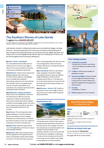 36 saga.co.uk/sessg To book, call 0808 278 5931 or visit saga.co.uk/europeITALYViews across Lake GardaYour holiday includes%u2022 4 excursions and visits%u2022 Guided tours of Venice, Lake Garda, Verona and Bolzano and Renon (with cable car)%u2022 7 nights in hotel (accommodation as specified or similar)%u2022 International flights. Prices are based on return flights with British Airways or easyJet from London Heathrow or Gatwick. Supplements may apply from other airports%u2022 14 meals:7 breakfasts, 7 dinners %u2022 PLUS see page 4 for more inclusionsDates2026April 21May 19June 9, 16September 22October 6Single supplement: from %u00a3120# Offer ends Friday 30 January 2026 - see page 3 for full details.Price is subject to change and will be confirmed upon enquiry.Hotel Du Parc (4*)Just a stone%u2019s throw from the beach or caf%u00e9s of Colombare town, Hotel Du Parc enjoys a peaceful spot facing the lake in Sirmione. At the hotel, opt for a morning dip in the pool, hire a bicycle (at own cost) and explore, and indulge in traditional dishes in the restaurant. Modern rooms are en suite with terrace/balcony, heating/air-conditioning, TV, safe, mini-bar, hairdryer and free Wi-Fi.Local ratings. Accommodation may change, but will always be of a similar standard.Take a romantic gondola ride, venture to the surrounding islands, climb to the top of St Mark%u2019s Bell Tower, or browse the stalls at the Rialto market.Day 7 Lake Garda. We%u2019ll tour Lake Gardatoday, stopping in characterful villages including the hamlet of Lazise, the cobbled village of Malcesine, and Riva with its uniquely Austrian flavour. In the afternoon we cross the lake by ferry to Limone for free time exploring its picturesque streets and lemon groves.Day 8 Sirmione - Verona - UK. Transfer to the airport for your return flight to the UK. Upon arrival, your vehicle will be waiting for the journey home.Day 1 UK - Verona - Lake Garda.Our nationwide shared chauffeur service collects you from home for your flight to Verona. On arrival we transfer to Sirmione, on the shores of beautiful Lake Garda.Day 2 Sirmione. Today is free to explore the beautiful lakeside town of Sirmione. The 13th-century castle is a real highlight and is incredibly well maintained. Alternatively, experience the town%u2019s Roman thermal baths, which are supplied by the mineral-rich water that bubbles out of Lake Garda. You could also spend some time visiting the Grotto of Catullus.Day 3 Dolomites - Bolzano and Renon.We journey to stunning Bolzano, where we can take the short cable car over hilly vineyards and valleys to Soprabolzano. We%u2019ll continue exploring the Renon plateau via Ritten%u2019s narrow-gauge railway. Then we%u2019re in for a treat as we round off our day with a slice of local apple strudel and a cup of coffee.Day 4 Verona. This morning starts with a guided walking tour of Verona, taking in Roman and medieval remains, bustling Piazza Br%u00e1 and Juliet%u2019s balcony. You%u2019ll have a bit of time to explore on your own, before we head back to the hotel in the afternoon.Day 5 Sirmione. Spend the day at leisure - do a little sightseeing in Sirmione or enjoy a stroll along the lakefront.Day 6 Venice. We%u2019ll travel to Venice, where we take a guided tour through the historic centre, acquainting ourselves with its alleys and canals. The rest of the day is at leisure. VeniceSirmioneVERONALake GardaRivaItaly7Castello Scaligero, SirmioneLake Garda%u2019s shoreline is dotted with pretty towns and traditional villages, including Sirmione %u2013 the picturesque base from where you can explore this beautiful part of Italy. As well as time exploring the lake, you will venture into the mighty Dolomites and enjoy a trip on a narrow-gauge railway, spend a day in the %u2018floating city%u2019 of Venice, and see the key sights of Verona during a walking tour.The Southern Shores of Lake Garda7 nights from %u00a32,235 %u00a32,007per person based on two sharing, 6 October 2026. Including travel insurance and cancellation cover or a price reduction of %u00a331 if not required. See pages 128-131 for details.Fly from an airport near youYou can also fly from Manchester(Subject to availability, supplements may apply.)See pages 126-127 for further details.Save 10% off all holidaysfor a limited time only#1 Number of nightsVisitsPace 2Fly localStay & explore