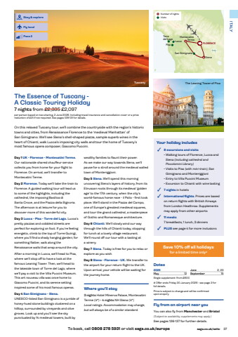 To book, call 0808 278 5931 or visit saga.co.uk/europe saga.co.uk/seitc 37ITALYYour holiday includes%u2022 8 excursions and visits%u2022 Walking tours of Florence, Lucca and Siena (including cathedral and Piccolomini Library)%u2022 Visits to Pisa (with mini-train), San Gimignano and Monteriggioni%u2022 Entry to Villa Puccini Museum%u2022 Excursion to Chianti with wine tasting%u2022 7 nights in hotels%u2022 International flights. Prices are based on return flights with British Airways from London Heathrow. Supplements may apply from other airports%u2022 11 meals:7 breakfasts, 1 lunch, 3 dinners %u2022 PLUS see page 4 for more inclusionswealthy families to flaunt their power. As we make our way towards Siena, we%u2019ll pause for a stroll around the medieval walled town of Monteriggioni.Day 5 Siena. We%u2019ll spend this morning uncovering Siena%u2019s layers of history, from its Etruscan roots through its medieval %u2018golden age%u2019 to the 17th century, when the city%u2019s world-famous horse race - il Palio - first took place. We%u2019ll stand in the Piazza del Campo, one of Europe%u2019s greatest medieval squares, and tour the grand cathedral, a masterpiece of Gothic and Romanesque architecture.Day 6 Chianti. We%u2019ll slowly wind our way through the hills of Chianti today, stopping for lunch at a lovely village restaurant. We%u2019ll round off our tour with a tasting at a winery.Day 7 Siena. Today is free for you to relax or explore as you wish. Day 8 Siena - Florence - UK. We transfer to the airport for your return flight to the UK. Upon arrival, your vehicle will be waiting for the journey home.Day 1 UK - Florence - Montecatini Terme.Our nationwide shared chauffeur service collects you from home for your flight to Florence. On arrival, we%u2019ll transfer to Montecatini Terme.Day 2 Florence. Today we%u2019ll take the train to Florence. A guided walking tour will lead us to some of the highlights, including the cathedral, the imposing Basilica di Santa Croce, and the Piazza della Signoria. The afternoon is at leisure for you to discover more of this wonderful city.Day 3 Lucca - Pisa - Torre del Lago. Lucca%u2019s pretty piazzas and cobbled streets are perfect for exploring on foot. If you%u2019re feeling energetic, climb to the top of Torre Guinigi, where you%u2019ll find a shady hanging garden; for something flatter, walk along the Renaissance walls that wrap around the city. After a morning in Lucca, we%u2019ll head to Pisa, where we%u2019ll stop off to have a look at the famous Leaning Tower. Then, we%u2019ll head to the lakeside town of Torre del Lago, where we%u2019ll pay a visit to the Villa Puccini Museum. This art nouveau villa was once home to Giacomo Puccini, and its serene setting inspired some of his most famous operas.Day 4 San Gimignano - Siena.UNESCO-listed San Gimignano is a jumble of honey-hued stone buildings clustered on a hilltop, surrounded by vineyards and olive groves. Look up and you%u2019ll see the sky punctuated by 14 medieval towers, built by FLORENCE PisaSan GimignanoSienaMontecatini TermeTorre del LagoLuccaItaly43On this relaxed Tuscany tour, we%u2019ll combine the countryside with the region%u2019s historic towns and cities, from Renaissance Florence to the %u2018medieval Manhattan%u2019 of San Gimignano. We%u2019ll see Siena%u2019s shell-shaped piazza, sample superb wines in the heart of Chianti, walk Lucca%u2019s imposing city walls and tour the home of Tuscany%u2019s most famous opera composer, Giacomo Puccini.The Essence of Tuscany - A%u00a0Classic%u00a0Touring%u00a0Holiday7 nights from %u00a32,335 %u00a32,097 per person based on two sharing, 2 June 2026. Including travel insurance and cancellation cover or a price reduction of %u00a331 if not required. See pages 128-131 for details.Stay & exploreFly localPace 2Dates2026May 12June 2, 23September 15Single supplement: from %u00a3600# Offer ends Friday 30 January 2026 - see page 3 for full details.Price is subject to change and will be confirmed upon enquiry.Where you%u2019ll stay3 nights Hotel Minerva Palace, Montecatini Terme (4*) %u2022 4 nights NH Siena (4*)Local ratings. Accommodation may change, but will always be of a similar standard.Fly from an airport near youYou can also fly from Manchester and Bristol(Subject to availability, supplements may apply.)See pages 126-127 for further details.Tuscany The Leaning Tower of PisaSave 10% off all holidaysfor a limited time only#1 Number of nightsVisits
