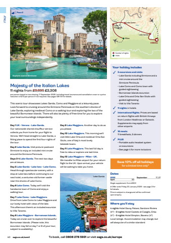 40 saga.co.uk/semil To book, call 0808 278 5931 or visit saga.co.uk/europeITALYYour holiday includes%u2022 5 excursions and visits%u2022 Lake Garda including Sirmione and a mini cruise around the Sirmione Peninsula%u2022 Lake Como and Como town with guided sightseeing%u2022 Borromean Islands excursion%u2022 Lake Orta and Orta San Giulio with guided sightseeing%u2022 Visit to Vila Taranto%u2022 11 nights in hotels%u2022 International flights. Prices are based on return flights with British Airways from London Heathrow or Gatwick. Supplements may apply from other airports%u2022 16 meals:11 breakfasts, 5 dinners %u2022 PLUS%u2022 Portable audio headset system on excursions%u2022 See page 4 for more inclusionsDates2026April 30September 17, 27Single supplement: from %u00a3900# Offer ends Friday 30 January 2026 - see page 3 for full details.Price is subject to change and will be confirmed upon enquiry.Day 9 Lake Maggiore. Another day to do as you please.Day 10 Lake Maggiore. This morning we%u2019ll visit little Lake Orta and medieval Orta SanGiulio, one of Italy%u2019s most lovely lakeside towns.Day 11 Lake Maggiore. This last full day is free to relax or explore one last time.Day 12 Lake Maggiore - Milan - UK.We transfer to Milan airport for your return flight to the UK. Upon arrival, your vehicle will be waiting to take you home.Day 1 UK - Verona - Lake Garda.Our nationwide shared chauffeur service collects you from home for your flight to Verona. We%u2019ll head straight to Lake Garda, a fitting place to spend the first four nights of the tour.Day 2 Lake Garda. Visit picture-postcard Sirmione to enjoy an included mini cruise around the Sirmione Peninsula.Days 3-4 Lake Garda. The next two days are at leisure.Day 5 Lake Garda - Lake Iseo - Lake Como.Head through spectacular scenery with a stop at Lake Iseo before continuing to our next hotel, a centuries-old former castle near the shores of Lake Como.Day 6 Lake Como. Today we%u2019ll visit the handsome town of Como and enjoy a walking tour.Day 7 Lake Como - Lake Maggiore.Drive from Lake Como to Lake Maggiore and our lovely hotel with views of the lake. This afternoon there%u2019s an included excursion to Villa Taranto.Day 8 Lake Maggiore - Borromean Islands.Today we cruise over to explore the beautiful Borromean Islands. (Please note, this excursion may fall on day 7 or 8 of your tour, subject to availability).Italy4 Lake Garda2 Lake Como 5 Lake MaggioreVERONAMilanExplore scenic SirmioneThis scenic tour showcases Lakes Garda, Como and Maggiore at a leisurely pace. Look forward to cruising around the Sirmione Peninsula on the southern shores of Lake Garda, exploring medieval Como on a walking tour and exploring the two of the beautiful Borromean Islands. There will also be plenty of free time for you to explore your local surroundings independently. Majesty of the Italian Lakes11 nights from %u00a33,695 %u00a33,308per person based on two sharing, 17 September 2026. Including travel insurance and cancellation cover or a price reduction of %u00a372 per person if not required. See pages 128-131 for details.Pace 2Where you%u2019ll stay4 nights Hotel Savoy Palace, Gardone Riviera (4*) %u2022 2 nights Hotel Castelo di Casiglio, Erba (4*) %u2022 5 nights Hotel Simplon, Baveno (4*)Local ratings. Accommodation may change, but will always be of a similar standard.Lake GardaSave 10% off all holidaysfor a limited time only#1 Number of nightsVisits