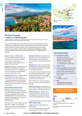 42 saga.co.uk/seign To book, call 0808 278 5931 or visit saga.co.uk/europeSICILYYour holiday includes%u2022 3 excursions and visits%u2022 Guided tour of Taormina%u2022 Guided visit and drinks tasting at Radicepura Garden Festival %u2022 Full-day excursion to Ortigia (including guided tour and boat trip)%u2022 7 nights in hotel%u2022 International flights. Prices are based on return flights with British Airways or easyJet from London Heathrow or Gatwick. Supplements may apply from other airports%u2022 14 meals:7 breakfasts, 7 dinners %u2022 PLUS%u2022 Tea/coffee after evening meals%u2022 See page 4 for more inclusionsDates2026May 11June 8, 22September 21October 5Single supplement: from %u00a3400# Offer ends Friday 30 January 2026 - see page 3 for full details.Price is subject to change and will be confirmed upon enquiry.Day 5 Giardini Naxos. Enjoy another free day today, or join us for an optional trip to Mount Etna (with lunch and a chance to taste a selection of volcanic wines and local honey).Day 6 Syracuse. Today, we%u2019ll journey down the coast towards Syracuse. We%u2019ll make our way to Ortigia, the old part of the city and one of Sicily%u2019s loveliest spots.A local guide will lead us through the maze of narrow streets to Piazza del Duomo, edged by baroque palazzi. As the name suggests, the square%u2019s centrepiece is its Duomo - our guide will show us its treasures.After some free time, we%u2019ll enjoy a harbour boat trip to allow us to admire Ortigia from the water.Day 7 Giardini Naxos. Your final full day in Sicily is at leisure. Relax by the pool or on the beach, or go for a stroll along the seafront.Day 8 Giardini Naxos - Catania - UK.Today we depart for the airport and your return flight to the UK. Upon arrival, your vehicle will be waiting for the journey home.Day 1 UK - Catania - Giardini Naxos .Our nationwide shared chauffeur service collects you from home for your flight to Sicily. On arrival, we transfer to Giardini Naxos, a lovely coastal resort in Sicily%u2019s north-east corner.Day 2 Taormina. After a leisurely start, we%u2019ll head off to the clifftop town of Taormina. A local guide will take us on a walking tour of the town, introducing us to the highlights (and a few hidden gems as well).Day 3 Giardini Naxos. You%u2019ve got the day to relax at the hotel or explore a little of Giardini Naxos. If you fancy heading back up to Taormina, the bus stop is a five-minute walk from the hotel. For a flavour of Sicily%u2019s Greek history, the Teatro Antico di Taormina is worth a visit.Day 4 Radicepura Garden Festival - Acireale. The botanical gardens at Radicepura play host to a biennial festival that celebrates garden design and landscape architecture. We%u2019ll spend the morning enjoying a guided tour around some of the beautifully created gardens, and pause for a tasting experience of locally produced drinks.After free time in nearby Acireale, a baroque town set on a hillside, our route back to Giardini Naxos takes us via the seaside town of Aci Castello, where you%u2019ll have time for a wander.CATANIASyracuseMt EtnaGiardini Naxos TaorminaOrtigiaRadicepuraSicily7Views across TaorminaSyracuse, SicilyStay in the charming coastal resort of Giardini Naxos and combine days at leisure with days spent exploring on a selection of included excursions. Stroll through the narrow streets of ancient Taormina, home to a Greek theatre and Corinthian columns, on a guided tour. Admire botanical displays at the Radicepura GardenFestival and enjoy a boat trip around the historic harbour of Ortigia during a full day visit.Sicilian Escape7 nights from %u00a32,335 %u00a32,097per person based on two sharing, 11 May 2026. Including travel insurance and cancellation cover or a price reduction of %u00a331 if not required. See pages 128-131 for details.Stay & explorePace 1Where you%u2019ll stay7 nights Hotel Naxos Beach Resort (4*), Giardini NaxosLocal ratings. Accommodation may change, but will always be of a similar standard.Save 10% off all holidaysfor a limited time only#1 Number of nightsVisits