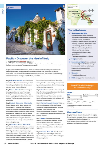 46 saga.co.uk/sepug To book, call 0808 278 5931 or visit saga.co.uk/europeITALYYour holiday includes%u2022 12 excursions and visits%u2022 Guided tours of Lecce (including entrance to the cathedral and Basilica di Santa Croce), and Matera%u2022 Visits to Otranto, Ostuni (with olive oil tasting), Cisternino, Alberobello (with wine tasting), Castellana Caves, Martina Franca, Bari, Castel del Monte and Taranto Marta Archaeological Museum with guided tour%u2022 Tasting at a local bakery in Lecce%u2022 7 nights in hotels%u2022 International flights. Prices are based on return flights with British Airways from London Heathrow or Gatwick. Supplements may apply from other airports%u2022 13 meals:7 breakfasts, 6 dinners %u2022 PLUS see page 4 for more inclusionsDates2026May 18June 15September 7, 21October 5Single supplement: from %u00a3400# Offer ends Friday 30 January 2026 - see page 3 for full details.Price is subject to change and will be confirmed upon enquiry.found in and around the town. We visit a winery here for a wine tasting accompanied by some local products. Dinner this evening will be at a local masseria.Day 5 Bari. We travel to the old port city of Bari. The Romanesque Basilica di San Nicolais dedicated to St Nicholas, or Father Christmas. There is free time for lunch, before an included visit to Castel del Monte in the afternoon.Day 6 Martina Franca & Taranto. Today we visit the hilltop town of Martina Franca, wandering attractive piazzas and baroque wonders. Enjoy exploring the Marta Archaeological Museum in Taranto, with a guided tour, before transferring to our hotel in Taranto.Day 7 Matera. Today we visit Matera, famous for unique cave dwellings dating back to the end of the first millennium. After our morning guided tour of the rock church and caves, we have an afternoon at leisure.Day 8 Taranto - Bari - UK. Transfer to the airport for your return flight to the UK. Upon arrival, your vehicle will be waiting for the journey home.Day 1 UK - Bari - Otranto. Our nationwide shared chauffeur service collects you from home for your flight to Bari. On arrival we transfer to our hotel in Otranto.Day 2 Lecce - Otranto. This morning we take a guided tour of Lecce%u2019s baroque buildings and stop for a bakery tasting, before heading back to Otranto for time to explore. The Romanesque cathedral is a highlight.Day 3 Ostuni - Cisternino - Alberobello.Ostuni is a city which dates back to the Stone Age. It%u2019s known as the %u2018white city%u2019 thanks to its hilltop citadel being encased in white walls and surrounded by white-painted architecture. We enjoy an olive oil tasting here, before travelling on to Alberobello, with a break to stretch our legs in Cisternino - which also boasts a lovely whitewashed old town - along the way.Day 4 Castellana Caves - Alberobello.We drive to the Castellana Caves, a series of limestone caverns accidentally discovered in 1938. A guide will accompany you as you descend to explore the caves. We also visit Alberobello (there%u2019s a 15-minute walk to the town from the coach). Dozens of quirky trulli - circular, conical-roofed houses - can be LecceOtrantoOstuniCisternino MateraAlberobelloCastel del Monte BARICastellana CavesItaly223Martina Franca TarantoSee streets of %u2018trulli%u2019 houses in AlberobelloPuglia has a wealth of attractions, from its historic cities and fairytale towns to its seemingly endless olive groves and diverse coastline that stretches for almost 500 miles. This tour will reveal Alberobello%u2019s trulli houses, the ancient cave dwellings of Matera, Lecce%u2019s baroque architecture, and more.Puglia - Discover the Heel of Italy7 nights from %u00a32,535 %u00a32,277per person based on two sharing, 5 October 2026. Including travel insurance and cancellation cover or a price reduction of %u00a331%u00a0if%u00a0not required. See pages 128-131 for details.Pace 2Where you%u2019ll stay2 nights Vittoria Resort, Otranto (4*) %u2022 3 nightsGrand Hotel la Chiusa di Chietri, Alberobello (4*) %u2022 2 nights Hotel Delfino Taranto (4*)Local ratings. Accommodation may change, but will always be of a similar standard.Save 10% off all holidaysfor a limited time only#1 Number of nightsVisits