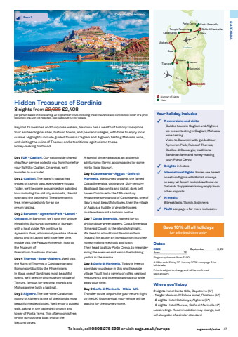 To book, call 0808 278 5931 or visit saga.co.uk/europe saga.co.uk/seisa 47SARDINIAColourful CastelsardoYour holiday includes%u2022 11 excursions and visits%u2022 Guided tours in Cagliari and Alghero%u2022 Ice cream tasting in Cagliari; Malvasia wine tasting%u2022 Visits to Barumini with guided tour; Aymerich Park; Ruins of Tharros; Basilica di Saccargia; traditional Sardinian farm and honey-making tour; Porto Cervo%u2022 8 nights in hotels%u2022 International flights. Prices are based on return flights with British Airways or easyJet from London Heathrow or Gatwick. Supplements may apply from other airports%u2022 14 meals:8 breakfasts, 1 lunch, 5 dinners %u2022 PLUS see page 4 for more inclusionsDates2026June 16September 8, 22Single supplement: from %u00a3400# Offer ends Friday 30 January 2026 - see page 3 for full details.Price is subject to change and will be confirmed upon enquiry.A special dinner awaits at an authentic agriturismo (farm), accompanied by some mirto (local liqueur).Day 6 Castelsardo - Aggius - Golfo di Marinella. We journey towards the famed Costa Smeralda, visiting the 12th-century Basilica di Saccargia and its tall, dark bell tower. Continue to the 13th-century Aragonese stronghold of Castelsardo, one of Italy%u2019s most beautiful villages, then the village of Aggius, a huddle of granite houses clustered around a historic centre.Day 7 Costa Smeralda. Named for its brilliant blue-green waters, Costa Smeralda(Emerald Coast) is the island%u2019s highlight. We head to a traditional Sardinian farm (stazzu) for a tour, an introduction into their honey-making methods and lunch. Then head to glitzy Porto Cervo, to meander along the avenues and watch the bobbing yachts in the marina.Day 8 Golfo di Marinella. Today is free to spend as you please in this small seaside village. You%u2019ll find a variety of caf%u00e9s, seafood restaurants and interesting shops to while away your time.Day 9 Golfo di Marinella - Olbia - UK.Transfer to the airport for your return flight to the UK. Upon arrival, your vehicle will be waiting for the journey home.Day 1 UK - Cagliari. Our nationwide shared chauffeur service collects you from home for your flight to Cagliari. On arrival, we%u2019ll transfer to our hotel.Day 2 Cagliari. The island%u2019s capital has traces of its rich past, everywhere you go. Today, we%u2019ll become acquainted on a guided tour including the old city ramparts, the old town and the cathedral. The afternoon is free, interrupted only for an ice cream tasting.Day 3 Barumini - Aymerich Park - Laconi - Oristano. In Barumini, we%u2019ll tour the unique Megalithic Su Nuraxi complex of Nuraghi with a local guide. We continue to Aymerich Park, a botanical paradise of rare plants and in Laconi we%u2019ll have free time, maybe visit the Palazzo Aymerich, host to the Museum of Prehistoric Sardinian Statues.Day 4 Tharros - Bosa - Alghero. We%u2019ll visit the Ruins of Tharros; a Carthaginian and Roman port built by the Phoenicians. In Bosa, one of Sardinia%u2019s most beautiful towns, we%u2019ll see the tiny museum-village of Tinnura, famous for weaving, murals and Malvasia wine (with a tasting).Day 5 Alghero. The one-time Catalonian colony of Alghero is one of the island%u2019s most beautiful medieval cities. We%u2019ll enjoy a guided walk, taking in the cathedral, church and tower of Porta Terra. This afternoon is free, or join our optional boat trip to the Nettuno caves.CAGLIARITharrosOristanoBaruminiLaconiBosaAlgheroCastelsardoGolfo di MarinellaOlbiaPorto Cervo Costa SmeraldaTempio PausaniaSardinia2 123Beyond its beaches and turquoise waters, Sardinia has a wealth of history to explore. Visit archaeological sites, historic towns, and peaceful villages, with time to enjoy local cuisine. Highlights include guided tours in Cagliari and Alghero, tasting Malvasia wine, and visiting the ruins of Tharros and a traditional agriturismo to see honey-making firsthand.Hidden Treasures of Sardinia8 nights from %u00a32,695 %u00a32,408per person based on two sharing, 22 September 2026. Including travel insurance and cancellation cover or a price reduction of %u00a372 if not required. See pages 128-131 for details.Pace 2Where you%u2019ll stay2 nights Hotel Santa Gilla, Capoterra (4*) %u2022 1 night Mariano IV Palace Hotel, Oristano (4*) %u2022 2 nights Hotel Catalunya, Alghero (4*) %u2022 3 nights Hotel Marana, Golfo di Marinella (4*)Local ratings. Accommodation may change, but will always be of a similar standard.Save 10% off all holidaysfor a limited time only#1 Number of nightsVisits