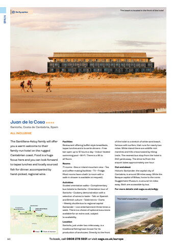 50 To book, call 0808 278 5931 or visit saga.co.uk/europeSPAINFacilitiesRestaurant offering buffet-style breakfasts, tapas lunches and %u00e1 la carte dinners %u2022 Free bar open up to 12 hours a day %u2022 Indoor heated swimming pool %u2022 Wi-Fi. There is a lift to all floors.Rooms71 rooms %u2022 Sea or inland mountain view %u2022 Tea and coffee-making facilities %u2022 TV %u2022 Fridge. Most rooms have a bath (a room with a walk-in shower is available on request).ActivitiesGuided orientation walks %u2022 Complimentary bus tickets to Santo%u00f1a %u2022 Orientation tour of Santo%u00f1a %u2022 Cookery demonstration with a selection of wines to taste %u2022 Talk on Spanish and British culture %u2022 Table tennis %u2022 Darts %u2022 Weekly shuttle bus to regional capital Santander %u2022 Live entertainment three times a week. There is a choice of optional excursions available for an extra cost, subject to availability.LocationSanto%u00f1a, just under two miles away, is a traditional fishing town known for its production of anchovies. Directly to the front of the hotel is a stretch of white sand beach, famous with surfers, that runs for nearly two miles. While inland there are wildlife-rich marshes and hills crisscrossed by hiking trails. The nearest bus stop from the hotel is 240 yards away. The drive to/from the airport takes approximately one hour.Out and aboutHistoric Santander, the capital city of Cantabria, is around 28 miles away. While the Basque capital of Bilbao, home to the iconic Guggenheim Museum, is around 44 miles away. Both are accessible by bus.For more details visit saga.co.uk/sn8gyThe Santillana-Astuy family will offer you a warm welcome to their family-run hotel on the rugged Cantabrian coast. Food is a huge focus here and you can look forward to tapas lunches and locally sourced fish for dinner, accompanied by hand-picked, regional wine.Juan de la Cosa HHHHSanto%u00f1a, Costa de Cantabria, SpainALL INCLUSIVE The beach is located in the front of the hotelThe hotel%u2019s beachfront locationS. Vicentede la BarqueraBilbao San Sebasti%u00e1nSantillana del MarSantander2536Pe%u00f1a Prieta2648Pe%u00f1a CerredoP I C O SD E E U R O P A Juan de la CosaSanto%u00f1aSPAI NF R A N C E%u2022No fly optionHotel Point of interest