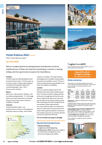 56 saga.co.uk/dn5g1 To book, call 0808 278 5931 or visit saga.co.uk/europe SPAINHotel Kaktus Albirmarket on Tuesdays %u2022 Pool table. Golf and bowling greens are available nearby (details and prices are available in resort). There is a choice of optional excursions available for an extra cost, subject to availability.LocationAlbir is a compact seaside resort in the foothills of the scenic Sierra Helada natural park. The hotel is located in Playas del Albir, at the end of a large bay, with the Penon de Ifach at Calpe at the other end. From here, you can walk into the centre of Albir around half-a-mile away, and venture along the level promenade to Altea, approximately two-and-a-half miles away. The nearest bus stop is 77 yards away. The drive to/from the airport takes approximately 50 minutes and the transfer coach pick-up and drop-off point is around 77 yards from the hotel.For more details visit saga.co.uk/dn5g1Special interest departures%u2022 Valencian Gardens7 nights from %u00a31,375 departing 22 September, 2026. Discover the region%u2019s renowned parks and gardens on four excursions. Holiday code: AH940FacilitiesA buffet restaurant offering Mediterranean and international cuisine %u2022 Free bar open up to 10 hours a day %u2022 Outdoor swimming pool %u2022 Rooftop swimming pool (heated and covered seasonally) %u2022 Gym %u2022 Wi-Fi.There is a lift to all floors.Rooms203 rooms %u2022 Side-sea views %u2022 Balcony %u2022 Tea and coffee making facilities %u2022 TV %u2022 Mini fridge. Most rooms have a bath with an overhead shower (a room with a walk-in shower is available on request).ActivitiesGuided orientation walks %u2022 Live entertainment a minimum of five nights per week plus a show on Friday %u2022 Visit to Altea AlteaHotel Kaktus AlbirAlbir%u2019s Blue Flag beach7 nights from %u00a3975Prices include insurance and cancellation cover or a price reduction if not required%u00a7.Dates and pricesPrices shown are the lowest available price in each month. Spaces are limited at these prices. Prices are per person, inclusive of any discounts, based on two people sharing.Nights 7 14 21 28Apr, 2026 %u00a3975 %u00a31,545 %u00a32,075 %u00a32,595May %u00a3995 %u00a31,625 %u00a32,095 %u00a32,625Jun %u00a31,045 %u00a31,625 %u00a32,145 %u00a32,665Sep %u00a31,075 %u00a31,675 %u00a32,195 %u00a32,725Oct %u00a31,075 %u00a31,625 %u00a32,125 %u00a32,645Lead prices: 7 nights from %u00a3975 based on 21 April, 2026 departure. Limited number of sole occupancy rooms at no extra cost, after which a supplement may apply, subject to availability.%u00a7 If you choose to opt out of the included insurance and cancellation cover, a reduction applies of %u00a331%u00a0(7 nights), %u00a372 (14 nights), %u00a3102 (21 nights) or %u00a3137 (28 nights) per person. See pages 128-131 for details.# Quote SAVE10 when booking. Offer ends Friday 30 January 2026 - see page 3 for full details.Price is subject to change and will be confirmed upon enquiry.With an enviable waterfront setting between lively Benidorm and the traditional town of Altea, this hotel has everything you need for a relaxing holiday, with the opportunity to explore the Costa Blanca.Hotel Kaktus Albir HHHHAlbir, Costa Blanca, SpainALL INCLUSIVEBenidorm Kaktus AlbirAlbir VillajoyosaJ%u00e1veaDeniaValenciaAlicanteGuadalestAitana(1558m)Cabo de la NaoC O S T ASPAI NB L A N C AMorairaGandia%u2022No single supplementHotelPoint of interestSave 10% off all 14-night+%u00a0holidaysfor a limited time only#