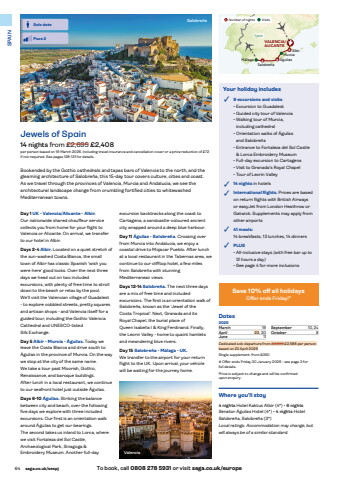 64 saga.co.uk/sespj To book, call 0808 278 5931 or visit saga.co.uk/europeSPAINVALENCIA/ALICANTESpain6 %u00c1guilas4 Albir4Salobre%u00f1aM%u00e1lagaMurciaYour holiday includes%u2022 9 excursions and visits%u2022 Excursion to Guadalest%u2022 Guided city tour of Valencia%u2022 Walking tour of Murcia, including cathedral%u2022 Orientation walks of %u00c1guilas and Salobre%u00f1a%u2022 Entrance to Fortaleza del Sol Castle & Lorca Embroidery Museum%u2022 Full-day excursion to Cartagena%u2022 Visit to Granada%u2019s Royal Chapel%u2022 Tour of Lecrin Valley%u2022 14 nights in hotels%u2022 International flights. Prices are based on return flights with British Airways or easyJet from London Heathrow or Gatwick. Supplements may apply from other airports%u2022 41 meals:14 breakfasts, 13 lunches, 14 dinners %u2022 PLUS%u2022 All-inclusive stays (with free bar up to 12 hours a day)%u2022 See page 4 for more inclusionsDates2026March 19April 23, 30June 11September 10, 24October 8Dedicated solo departure from %u00a32,895 %u00a32,588 per person based on 23 April 2026Single supplement: from %u00a3350# Offer ends Friday 30 January 2026 - see page 3 for full details.Price is subject to change and will be confirmed upon enquiry.excursion backtracks along the coast to Cartagena, a sandcastle-coloured ancient city wrapped around a deep blue harbour.Day 11 %u00c1guilas - Salobre%u00f1a. Crossing over from Murcia into Andalucia, we enjoy a coastal drive to Mojacar Pueblo. After lunch at a local restaurant in the Tabernas area, we continue to our clifftop hotel, a few miles from Salobre%u00f1a with stunning Mediterranean views.Days 12-14 Salobre%u00f1a. The next three days are a mix of free time and included excursions. The first is an orientation walk of Salobre%u00f1a, known as the %u2018Jewel of the Costa Tropical%u2019. Next, Granada and its Royal Chapel, the burial place of Queen Isabella I & King Ferdinand. Finally, the Lecrin Valley - home to quaint hamlets and meandering blue rivers.Day 15 Salobre%u00f1a - M%u00e1laga - UK.We transfer to the airport for your return flight to the UK. Upon arrival, your vehicle will be waiting for the journey home.Day 1 UK - Valencia/Alicante - Albir.Our nationwide shared chauffeur service collects you from home for your flight to Valencia or Alicante. On arrival, we transfer to our hotel in Albir.Days 2-4 Albir. Located on a quiet stretch of the sun-washed Costa Blanca, the small town of Albir has classic Spanish %u2018wish you were here%u2019 good looks. Over the next three days we head out on two included excursions, with plenty of free time to stroll down to the beach or relax by the pool. We%u2019ll visit the Valencian village of Guadalest - to explore cobbled streets, pretty squares and artisan shops - and Valencia itself for a guided tour, including the Gothic ValenciaCathedral and UNESCO-listed Silk Exchange.Day 5 Albir - Murcia - %u00c1guilas. Today we leave the Costa Blanca and drive south to %u00c1guilas in the province of Murcia. On the way we stop at the city of the same name. We take a tour past Moorish, Gothic, Renaissance, and baroque buildings. After lunch in a local restaurant, we continue to our seafront hotel just outside %u00c1guilas.Days 6-10 %u00c1guilas. Striking the balance between city and beach, over the following five days we explore with three included excursions. Our first is an orientation walk around %u00c1guilas to get our bearings. The second takes us inland to Lorca, where we visit Fortaleza del Sol Castle, Archaeological Park, Sinagoga & Embroidery Museum. Another full-day Salobre%u00f1aValenciaBookended by the Gothic cathedrals and tapas bars of Valencia to the north, and the gleaming architecture of Salobre%u00f1a, this 15-day tour covers culture, cities and coast. As we travel through the provinces of Valencia, Murcia and Andalucia, we see the architectural landscape change from crumbling fortified cities to whitewashed Mediterranean towns.Jewels of Spain14 nights from %u00a32,695 %u00a32,408per person based on 19 March 2026. Including travel insurance and cancellation cover or a price reduction of %u00a372 if not required. See pages 128-131 for details.Where you%u2019ll stay4 nights Hotel Kaktus Albir (4*) %u2022 6 nightsSenator %u00c1guilas Hotel (4*) %u2022 4 nights Hotel Salobre%u00f1a, Salobre%u00f1a (3*)Local ratings. Accommodation may change, but will always be of a similar standard.Save 10% off all holidaysOffer ends Friday!#1 Number of nights Visits Solo datePace 2