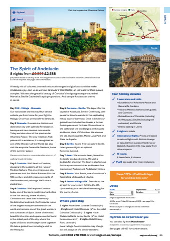 To book, call 0808 278 5931 or visit saga.co.uk/europe saga.co.uk/sesag 65SPAINM%u00c1LAGA JerezRondaCarmonaSevilleCordobaGranadaSpain2222Your holiday includes%u2022 7 excursions and visits%u2022 Guided tour of Alhambra Palace and Generalife Gardens%u2022 Visits to Medina Azahara (with guide); and Carmona%u2022 Guided tours of Cordoba (including the Mezquita); Seville (including the cathedral); and Ronda%u2022 Sherry tasting in Jerez%u2022 8 nights in hotels%u2022 International flights. Prices are based on return flights with British Airways or easyJet from London Heathrow or Gatwick. Supplements may apply from other airports%u2022 16 meals:8 breakfasts, 8 dinners %u2022 PLUS see page 4 for more inclusionsDates2026May 26June 16September 8, 22October 6Single supplement: from %u00a3650# Offer ends Friday 30 January 2026 - see page 3 for full details.Price is subject to change and will be confirmed upon enquiry.Day 5 Carmona - Seville. We depart for the capital of Andalucia, Seville. On the way, we%u2019ll pause for time to wander in the captivating hilltop town of Carmona. Once in Seville our guided tour includes the Alcazar, a former Arabic palace and fortress. We continue to the cathedral, the third largest in the world and burial place of Columbus. We also see the old Jewish quarter, Maria Luisa Park and Plaza de Espa%u00f1a.Day 6 Seville. You%u2019re free to explore Seville. Later you could join an optional flamenco evening.Day 7 Jerez. We arrive in Jerez, famed for its locally produced sherry. We visit a bodega for a tasting. The town is also famous for its equestrian activities and breeds fine examples of Arabian and Andalucian horses.Day 8 Ronda. Visit Ronda, one of Andalucia%u2019s fascinating whitewashed villages.Day 9 Jerez - M%u00e1laga - UK. Transfer to the airport for your return flight to the UK. Upon arrival, your vehicle will be waiting for the journey home.Day 1 UK - M%u00e1laga - Granada.Our nationwide shared chauffeur service collects you from home for your flight to M%u00e1laga. On arrival, we transfer to Granada.Day 2 Granada. Granada is a historic and distinctive city with splendid Renaissance, baroque and neo-classical monuments. Today we take a tour of the spectacular Alhambra Palace. The only medieval Arab palace still in existence, it is recognised as one of the Wonders of the World. We also visit the exquisite Generalife Gardens, home of the summer palace.Please note there is a considerable amount of walking involved today.Day 3 Cordoba. We%u2019ll head to Cordoba, stopping in the outskirts at the ruins of Medina Azahara. This once impressive city palace was built for Abd-al Rahman III in the 10th century and still retains remnants of tiled borders and paintings. We%u2019ll take a guided tour.Day 4 Cordoba. We%u2019ll explore Cordoba today, one of Europe%u2019s most important cities in the 11th century, where Muslims, Christians and Jews lived in harmony. Its distinctive landmark, the Mezquita, is one of the largest mosque-cathedrals in the world and remains one of the great wonders and curiosities of Spain. Some of the most beautiful churches and squares can be found in the oldest part of the city, where the styles of Gothic and Mudejar come together. We take a guided tour including a visit to the Mezquita.Visit the impressive Alhambra PalaceA heady mix of cultures, dramatic mountain ranges and glorious sunshine make Andalucia a joy. Join us as we tour Granada%u2019s %u2018Red Castle,%u2019 an intricate fortified palace complex. Witness the graceful beauty of Cordoba%u2019s intriguing mosque-cathedral. Marvel at Seville Cathedral%u2019s epic proportions. And sample Andalucian sherry in Jerez.The Spirit of Andalucia8 nights from %u00a32,895 %u00a32,588per person based on 26 May 2026. Including travel insurance and cancellation cover or a price reduction of %u00a372 if not required. See pages 128-131 for details.Fly localPace 3Where you%u2019ll stay2 nights Hotel Gran Luna de Granada (4*) %u2022 2 nights AC Hotel Cordoba (4*) or Sercotel C%u00f3rdoba Delicias (4*) %u2022 2 nights Hotel Catalonia Santa Justa, Seville (4*) or Hotel Ilunion Alcora (4*) %u2022 2 nights Hotel Sherry Park, Jerez (4*)Local ratings. Accommodation may change, but will always be of a similar standard.Fly from an airport near youYou can also fly from Manchester(Subject to availability, supplements may apply.)See pages 126-127 for further details.Ronda1 Number of nights Visits Save 10% off all holidaysfor a limited time only#